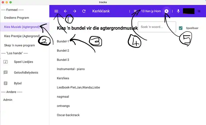 - “X Exit” - Eindig die speel van die liedjie en maak prentjie toe. Spring terug na die program en merk die item as gespeel. Sien pers band hieronder