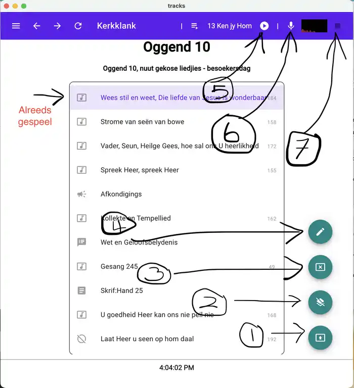 Projekteer program op die bord/skerm. Neem kennis dat eerste liedjie alreeds gespeel en die status ‘gemerk’ is. Ps. by die nuwer weergawe van die program, sal die alreeds gespeelde liedjies van die lys verwyder word