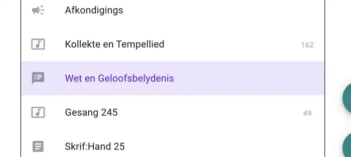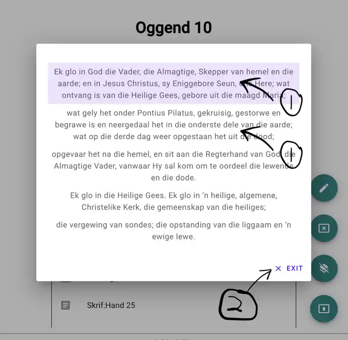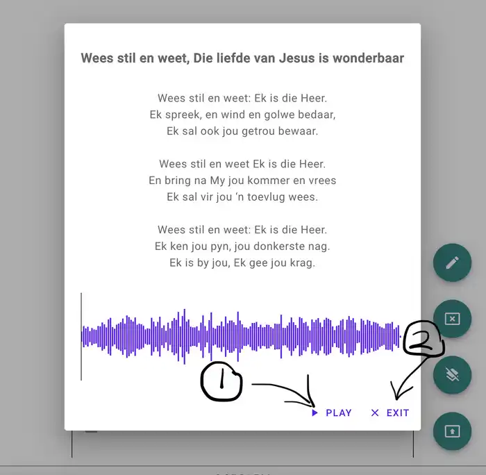 - “X Exit” - Eindig die projeksie van Geloofsbelydenis en maak prentjie toe. Spring terug na die program en merk die item as gespeel.
