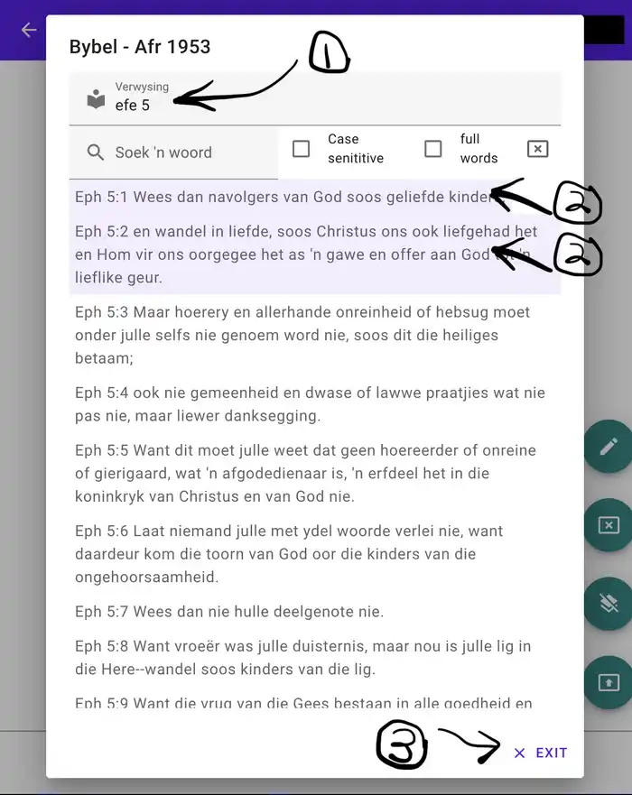 - Tik skrif verwysing. Die teks sal onder verskyn soos aangetoon. Gewoonlik is net die 3 eerste letters nodig soos bv efe vir Efesiërs, joh vir Johannes, 1jo vir 1 Johannes, 1kr vir 1 Kronieke, ens. Partykeer vier soos klaag vir Klaagliedere van Jeremia.