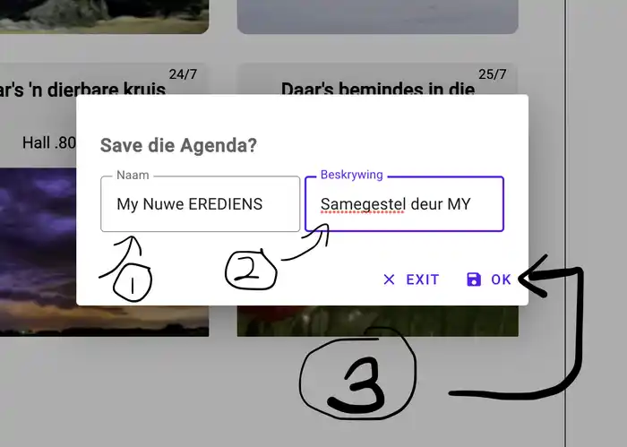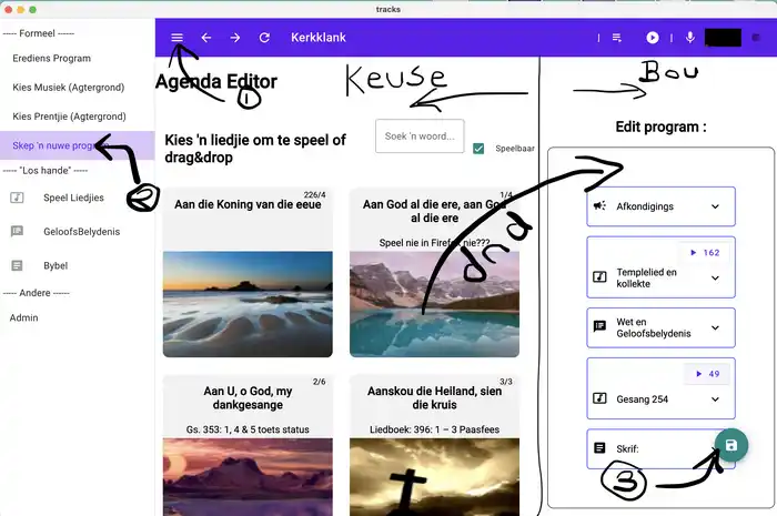 Kies die liedjies vanaf die linkerkant en trek (dnd - drag and drop)dit oor na die regterkant om sodoende die nuwe erediens program saam te stel. En wanneer dit goed en klaar is:Kilk op “Save” om die nuwe erediens program ’n naam te gee en te liaseer saam met al die ander erediens programme.