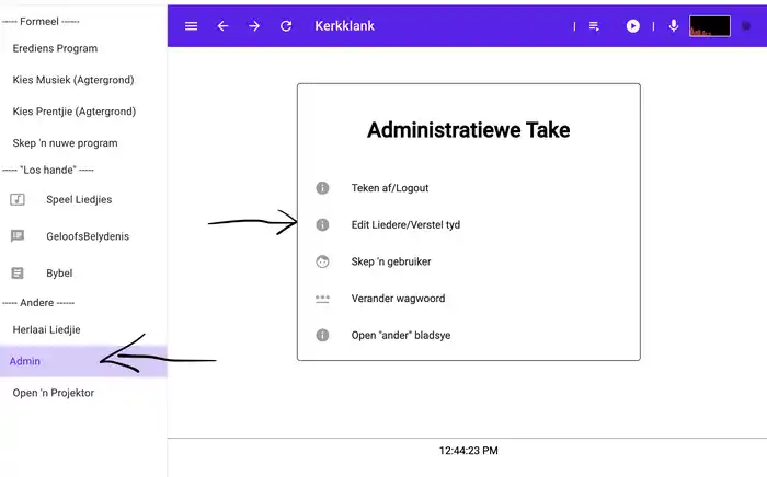 Vanaf die linkerkant (“menu”) kies “Admin” en dan “Edit Liedjie/Verstel tyd”.