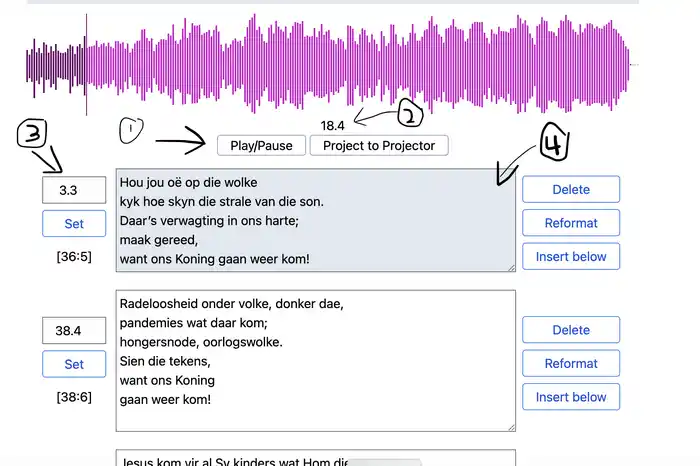 Wanneer die woorde bygevoeg en tyd-sinchroniseer is lyk dit as volg. Die woorde is opgebreek “woordeblokke” sodat dit op die projektorskerm sal pas (ongeveer 40 letters by 8 rye). Die grote van die blok word linksonder aangedui. Elke blok het ’n begin tyd.