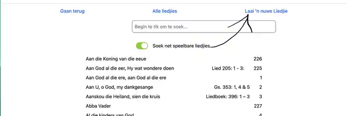 ’n Lys van al die liedjies verskyn in ’n nuwe bladsy. Die liedjies kan gekies word om na te luisteer, te edit en ook om nuwes te laai. Kies “Laai ’n nuwe Liedjie”.