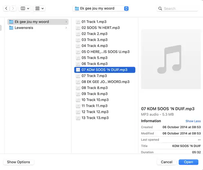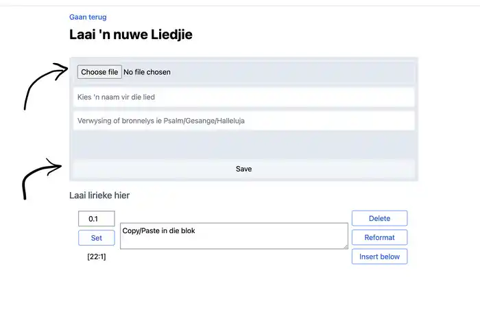 Kies die liedjie vanaf “Choose file”. Gee dit ’n naam en dit sal help om ’n verwysing te gee. As die liedjie se woorde beskikbaar is kan dit ook in gesit word. Die inligting kan later verander word - veral die woorde van die liedjie.