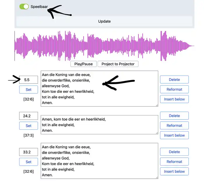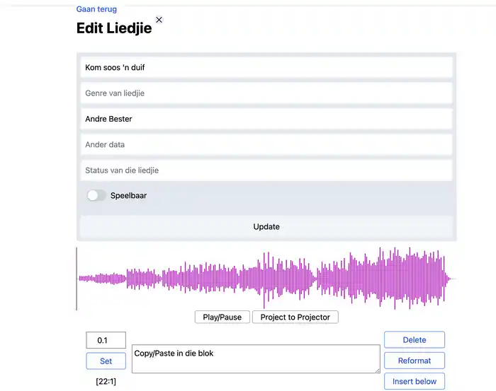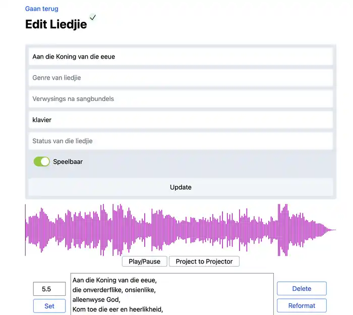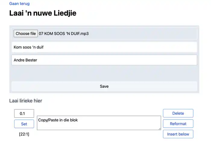 En dit is hoe dit lyk nadat die liedjie gelaai is. Die belangrikste om te onthou is dat die musiek (ie mp3) opgelaai is na die web program. Die woorde en die tydsverstellings kan na die tyd gemaak word.
